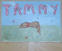 life. Like me you probably took hundreds of photos of best friend over the years. I have many albums filled with happy photos, and have framed many of them and also printed them on tee shirts. After Tammy died I felt like I needed to have more pictures of her around me, so I poured through them, which was difficult, but it helped me to feel close to her again. I selected some for framing and for scanning to use on this site etc. I decided to put together an album of her life, and you may also like to do this. You can include pictures, write favourite recollections, pedigree certificates, paw prints etc. It is hard to do, your heart will break, but maybe a certain picture may make you smile as you recall happier times. I discovered that making an album like this is called scrapbooking, which has given me a much loved and addictive interest. I have created some pages all about Dog Scrapbooking, you can view them here. I have kept her brush,comb and mac in a wooden box, I have put some of her soft fluffy hairs in a special Winnie the Pooh enamel pot, on the inside of the lid is says "Best Friends Until Forever" I have kept her collar and harness and these are heavenly as they still smell of her. I have also put some of her hairs in a transparent Key Ring fob which can also be used to put a picture in. Memorials ~ Tributes Printed Tributes I